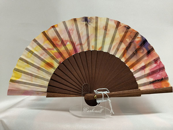 Polished kotibé wood fan with hand-painted natural silk. Made in Valencia. One piece in stock.